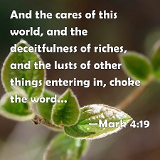 but the cares of the world and the deceitfulness of riches and the desires for other things enter in and choke the word, and it proves unfruitful. – Mark 4:19